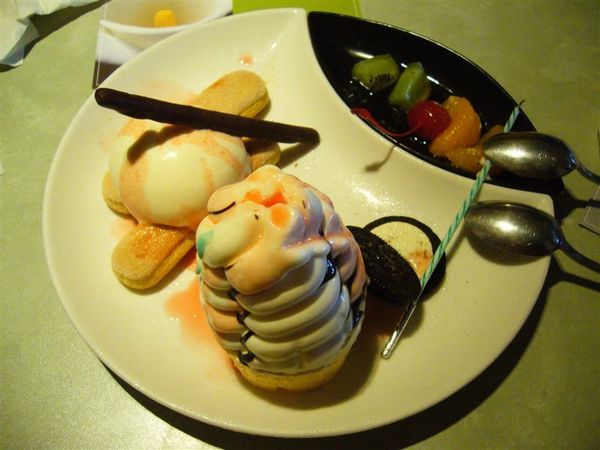 看到服務生拿了一個冰淇淋拼盤過來,然後還拿了幾頂帽子過來....