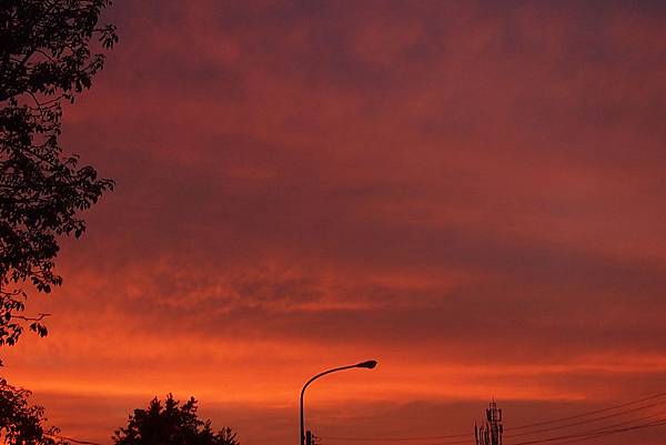 這是今天婚禮結束回家時,路上拍的夕陽。 稍微用了低光源的拍法,本來就已經通紅的天空就又更明顯了。